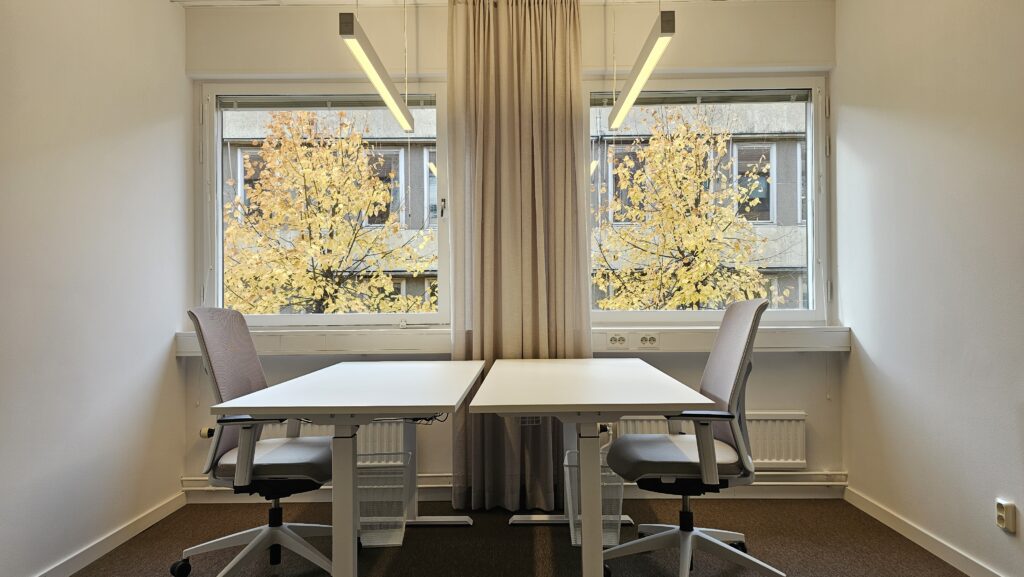 Hyr eget kontor för att arbeta ostört eller i team. Här finns ergonomiska stolar, höj- och sänkbara bord samt förvaring.